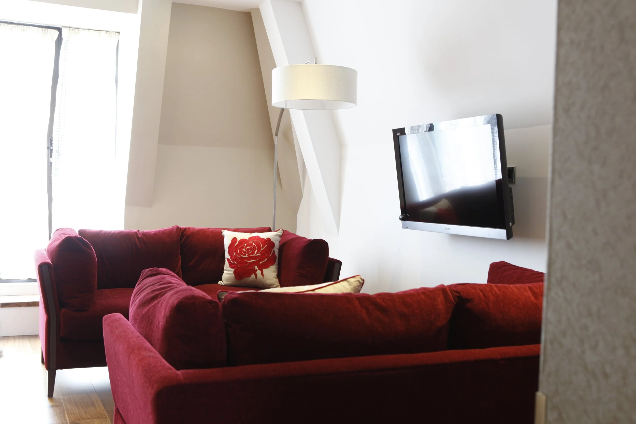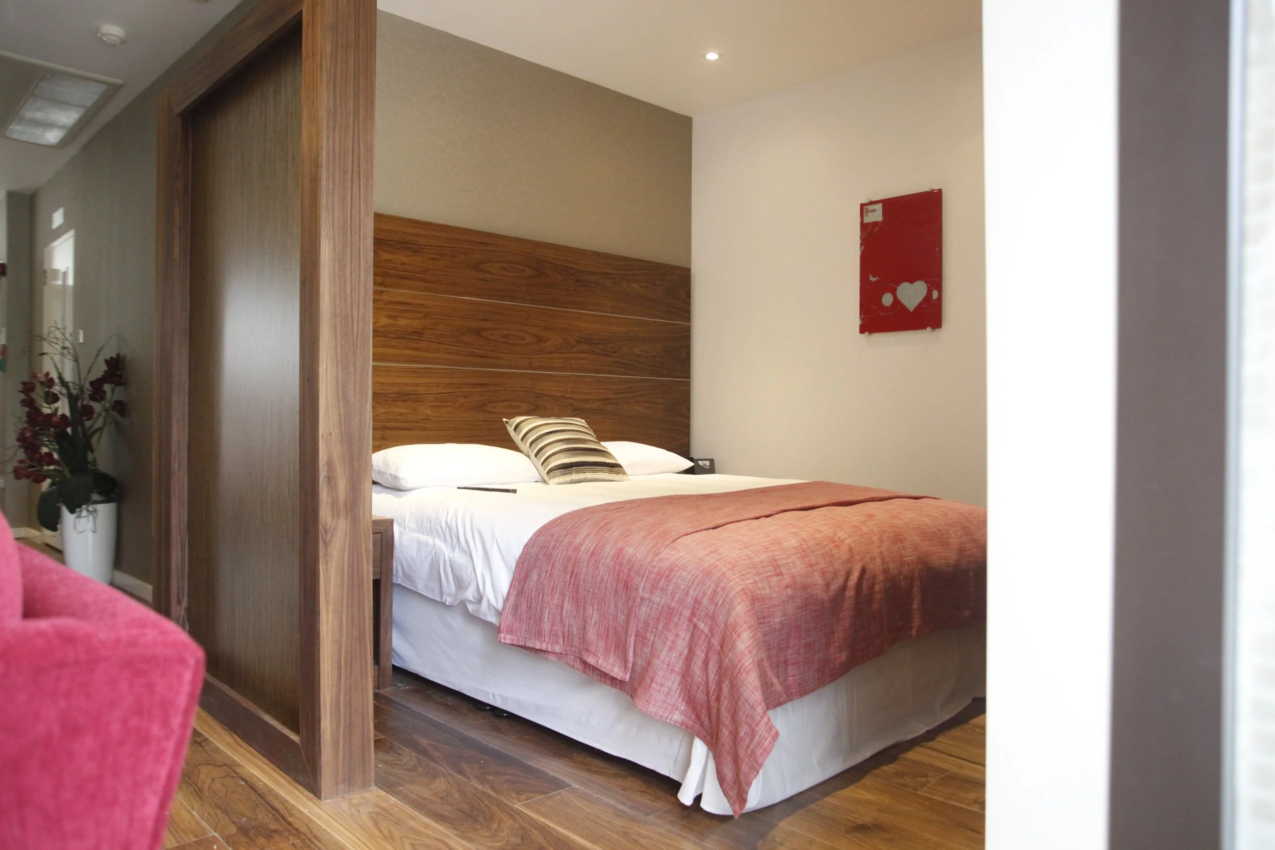 The Apartment offers both living and working areas, so the introduction of a bespoke hi-spec Media-wall divided the areas. Luxurious bespoke screens were commisioned using 3Form Acrylic panels encased in solid Walnut to give Wow-factor.